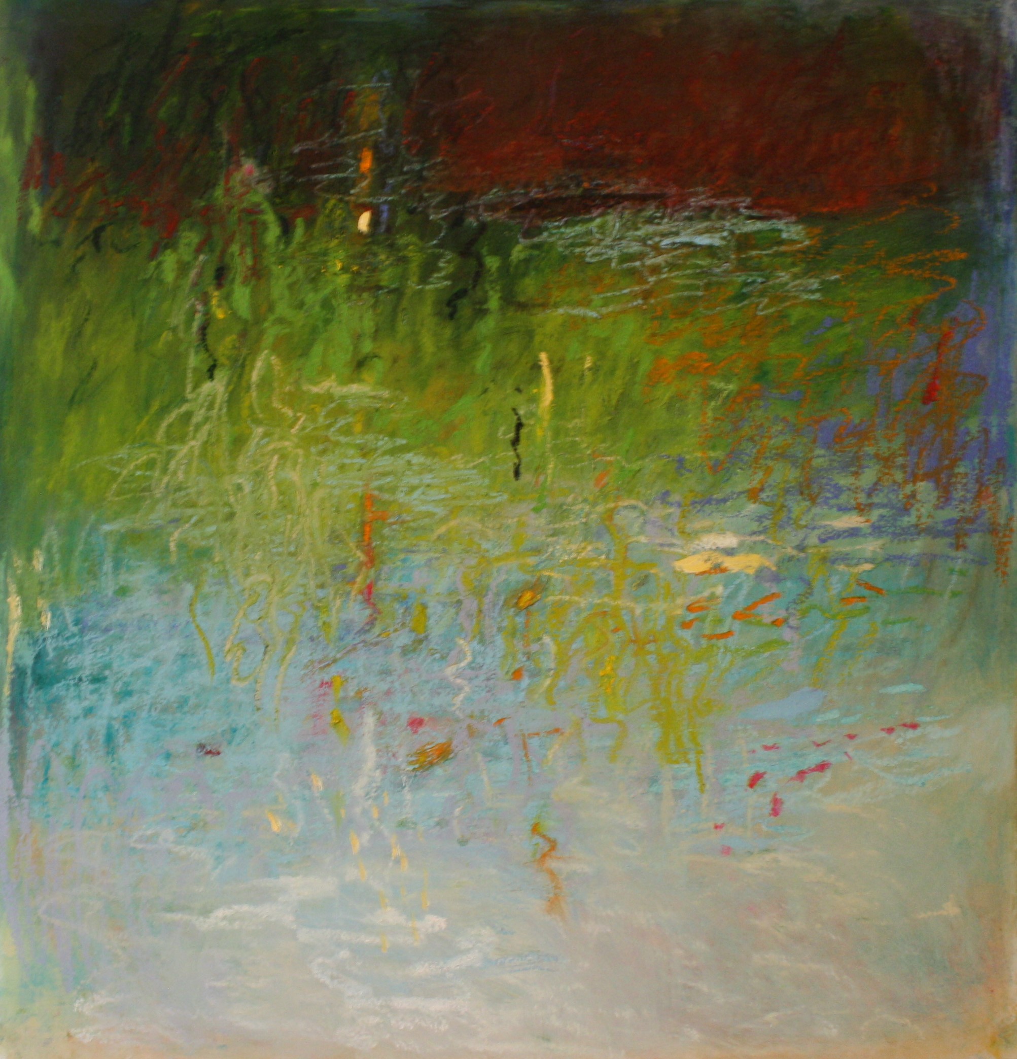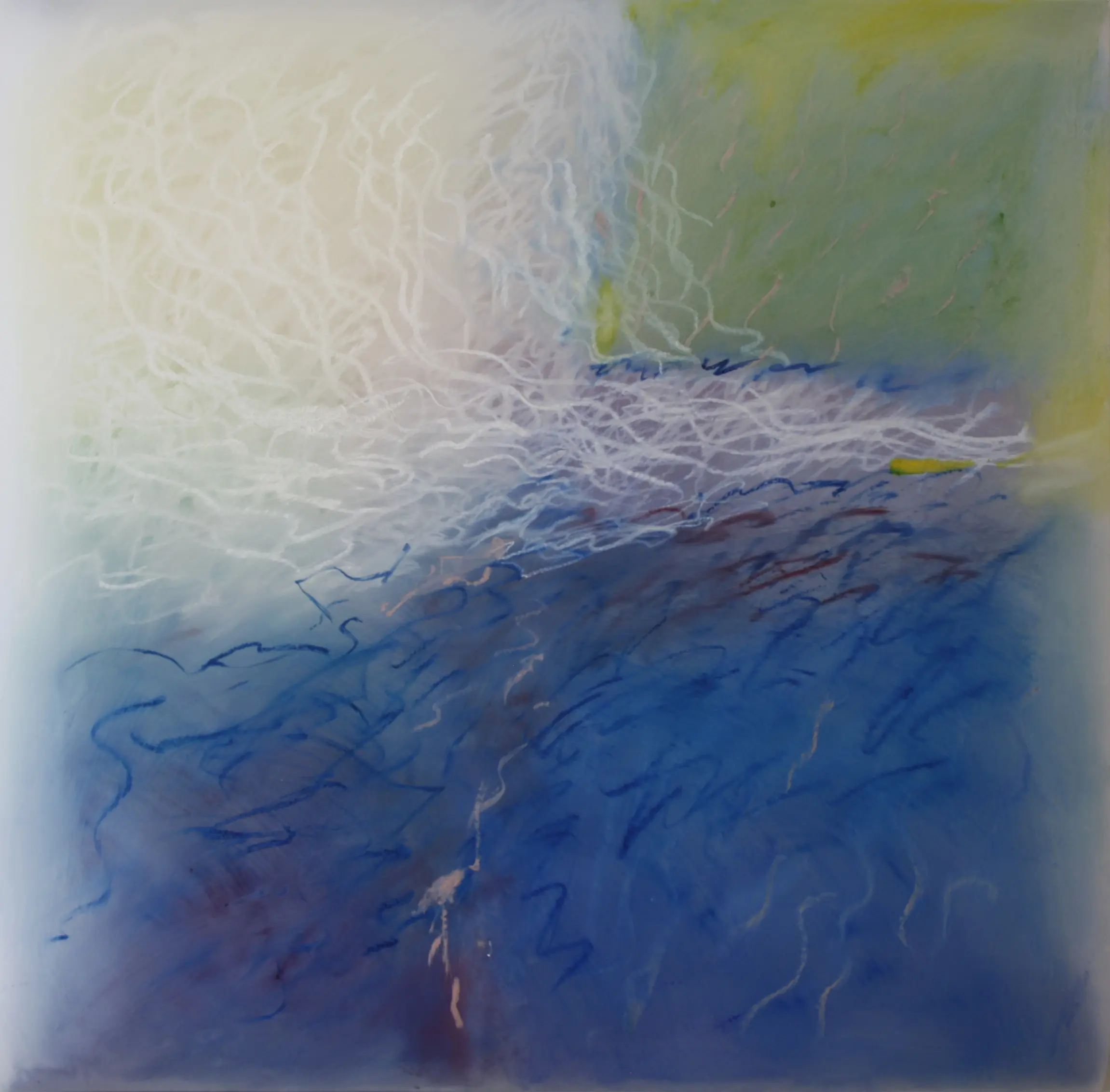 In ESTUARY, Gibson’s focus is on the lower course of a river where it flows into the sea, a transition zone between river environments and maritime environments. Salty tidal flows churn and seethe as they merge with fresh water. The rich nutrients resulting in teeming habitats for fish and wildlife, captured by Gibson in sensuous layers of oil stick glowing on and behind her translucent Mylar ‘canvases,’ her scribbled calligraphic strokes simultaneously metamorphosing into turbulent watery surges, schools of fish or roiling surf. For each viewer, it will be different. Yes, there is a mystery here; some will see straight lines as hints of man-made docks, piers or even, . . . shipwrecks.